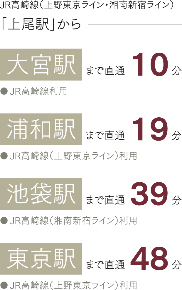 JR高崎線「上尾」駅から大宮駅まで約10分、