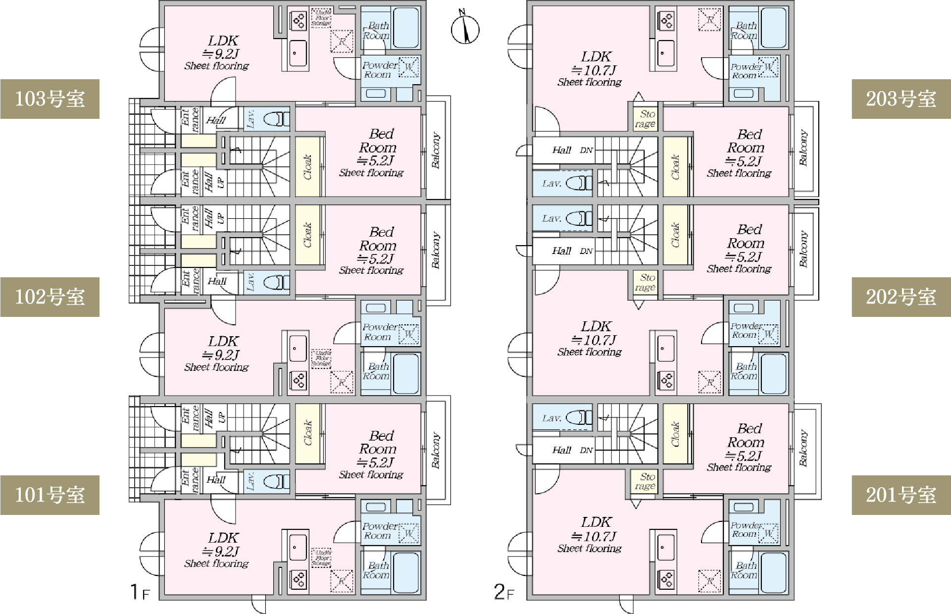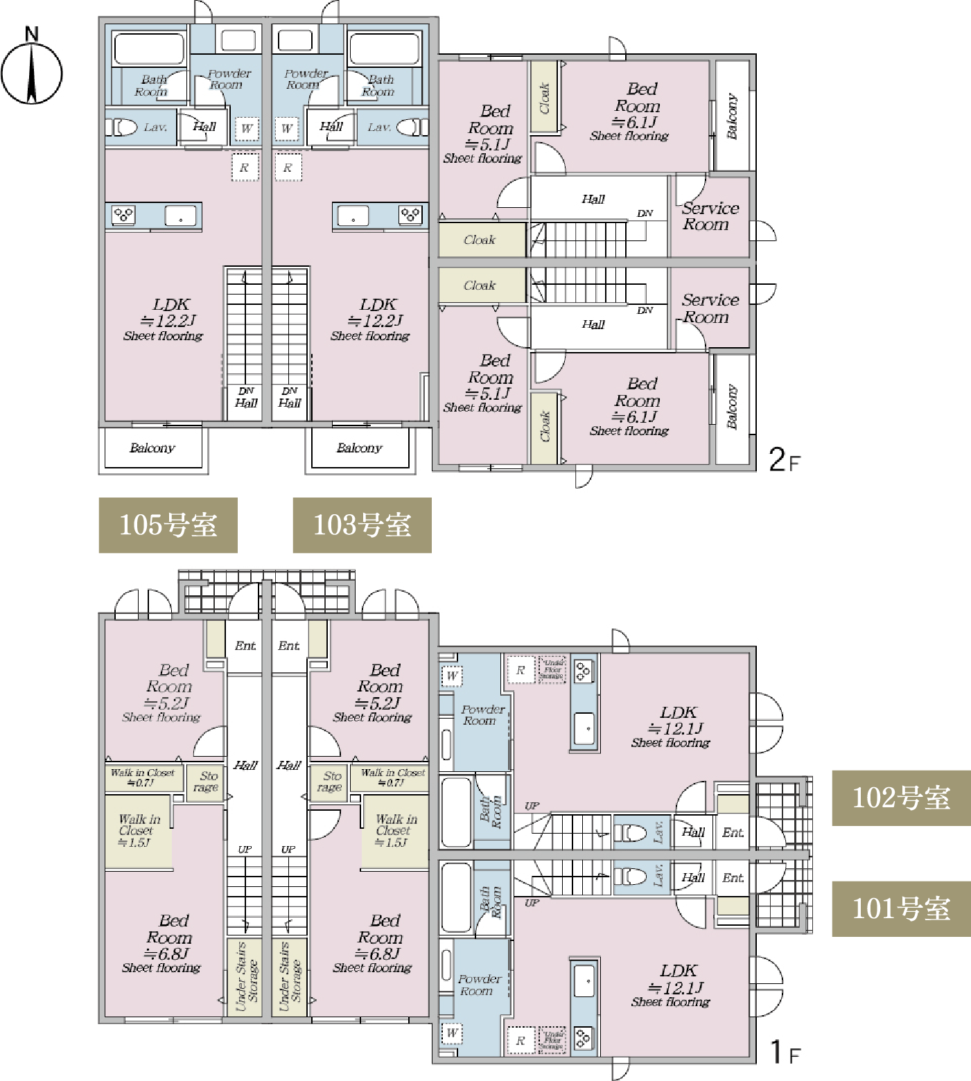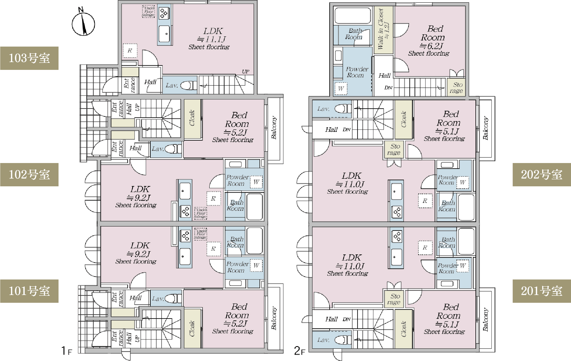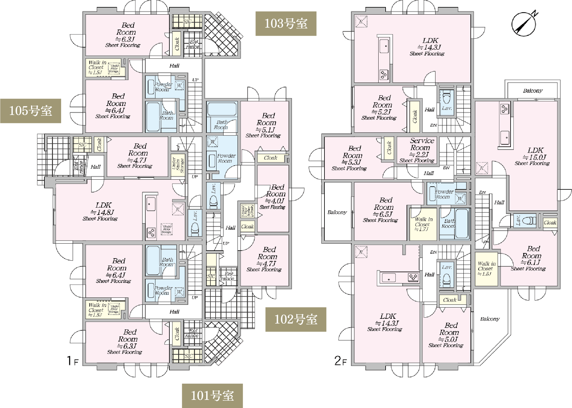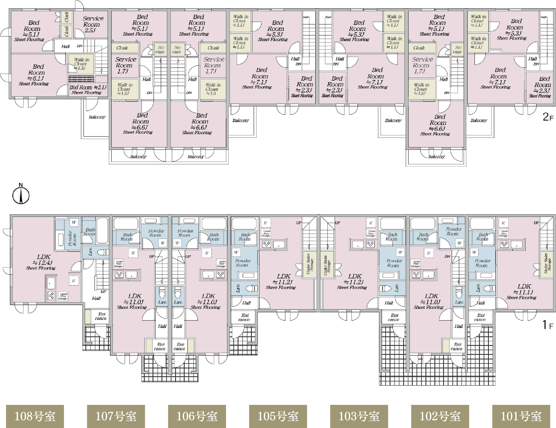 敷地中央に広がる庭のような空間を囲むように配置された住棟計画。1LDKから4LDKまで、多様なライフスタイルに応える間取りをご用意しました。テラスハウスならではの独立性と開放感を活かしながら、家族構成や働き方の変化にも柔軟に寄り添う住空間を実現。心地よい距離感とゆとりを備えたプランニングが、八幡山での穏やかな日常を支えます。